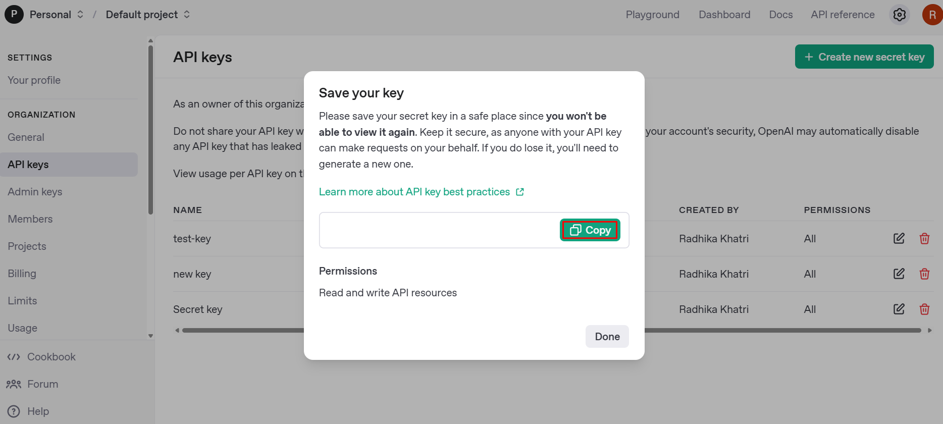 - You will not be able to view the key again after closing the dialog, so make sure to save it immediately.