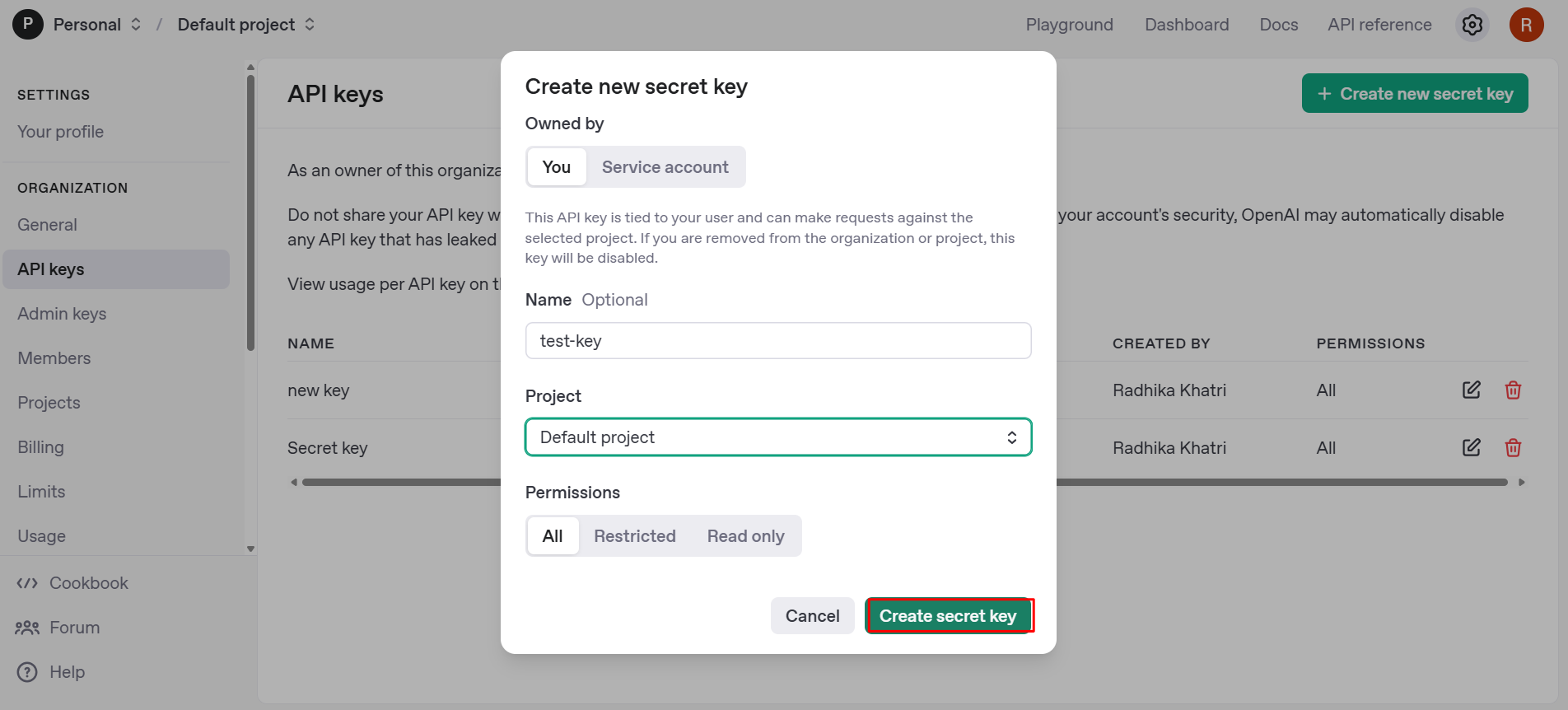 - Click “Create secret key.”